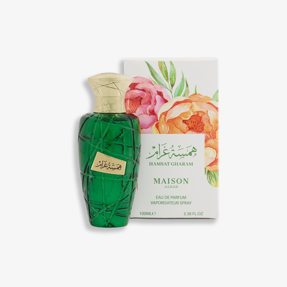 Hamsat Gharam combine des notes fruitées lumineuses, d'ylang-ylang et de tubéreuse avec une base chaude de patchouli, d'ambre et de musc pour un parfum captivant et romantique.