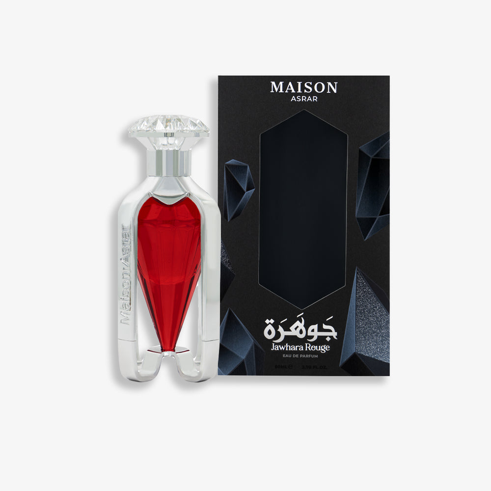 Jawhara Rouge – Un parfum floral fruité et vibrant aux notes d'agrumes rafraîchissantes, de fruit de la passion et de litchi. Le magnolia et la violette apportent une touche d'élégance, tandis que le musc, le cachemire, le bois de cèdre et le caramel créent un final luxueux et sophistiqué.