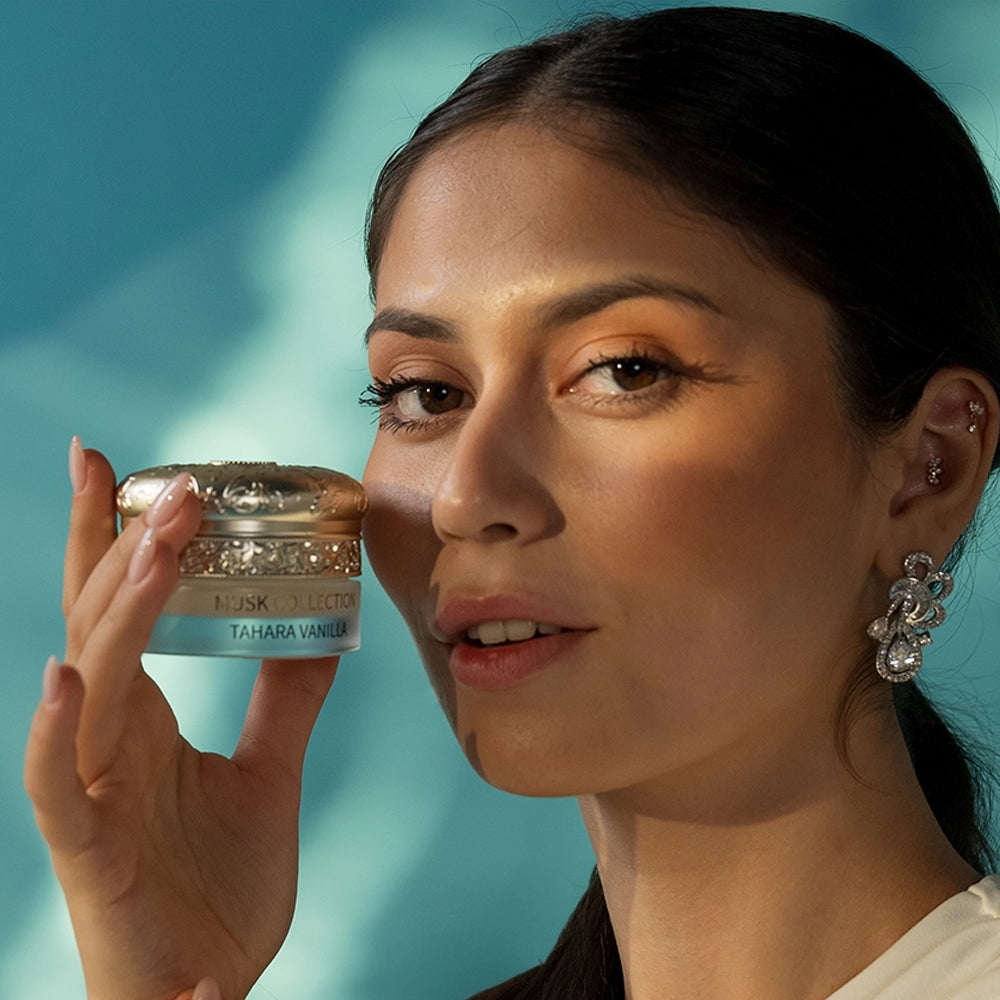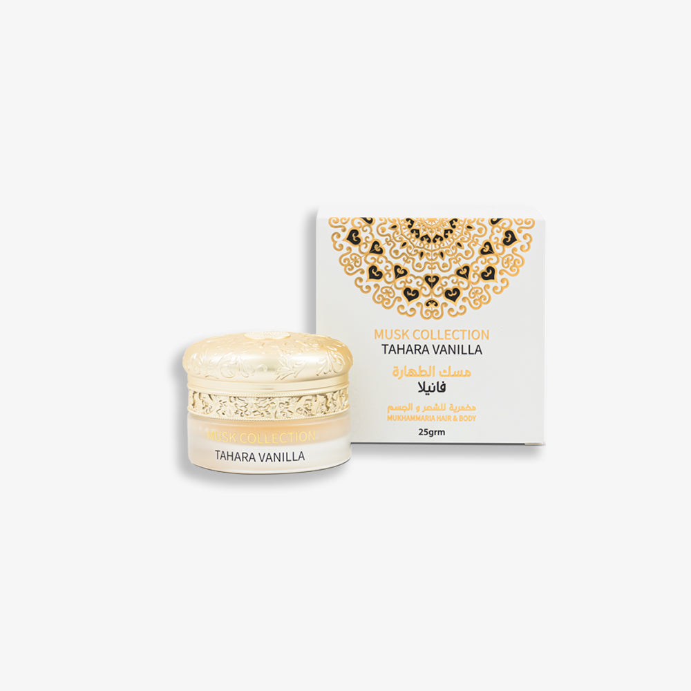 Musc Tahara Mukhammaria- Vanille : Un baume floral musqué luxueux pour le corps et les cheveux, mêlant des notes florales douces et des notes chaudes de vanille pour un arôme unique et durable