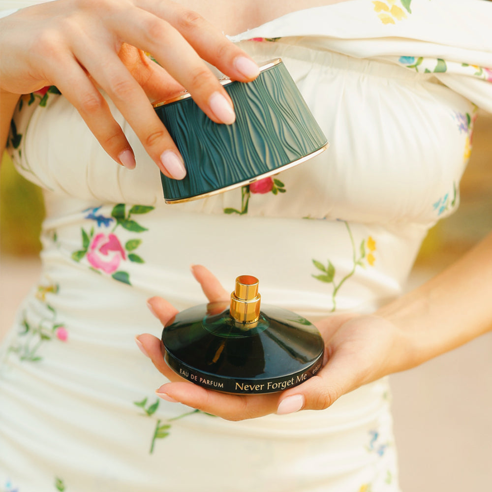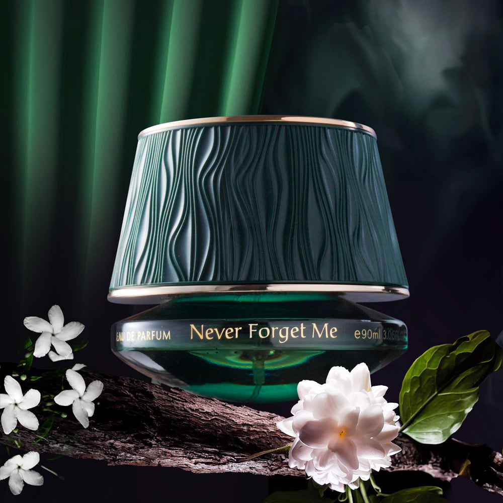 Never Forget Me – Un parfum floral aux notes de muguet et de pêche, laissant place à un cœur de gardénia, de jasmin et d'ylang-ylang. L'ambre gris, le musc et la vanille créent une présence chaleureuse et durable.
