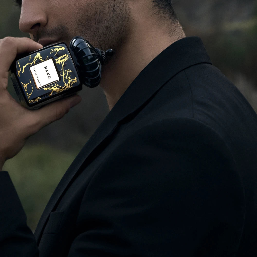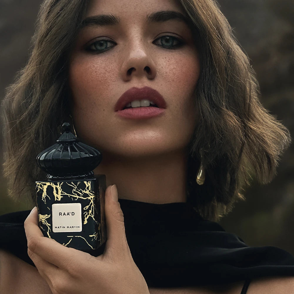 Named after thunder, Raa’d strikes with an unforgettable blend of coffee blossoms, saffron, and nutmeg. The storm builds with iris and lily of the valley before grounding itself in amber, musk, and creamy vanilla.