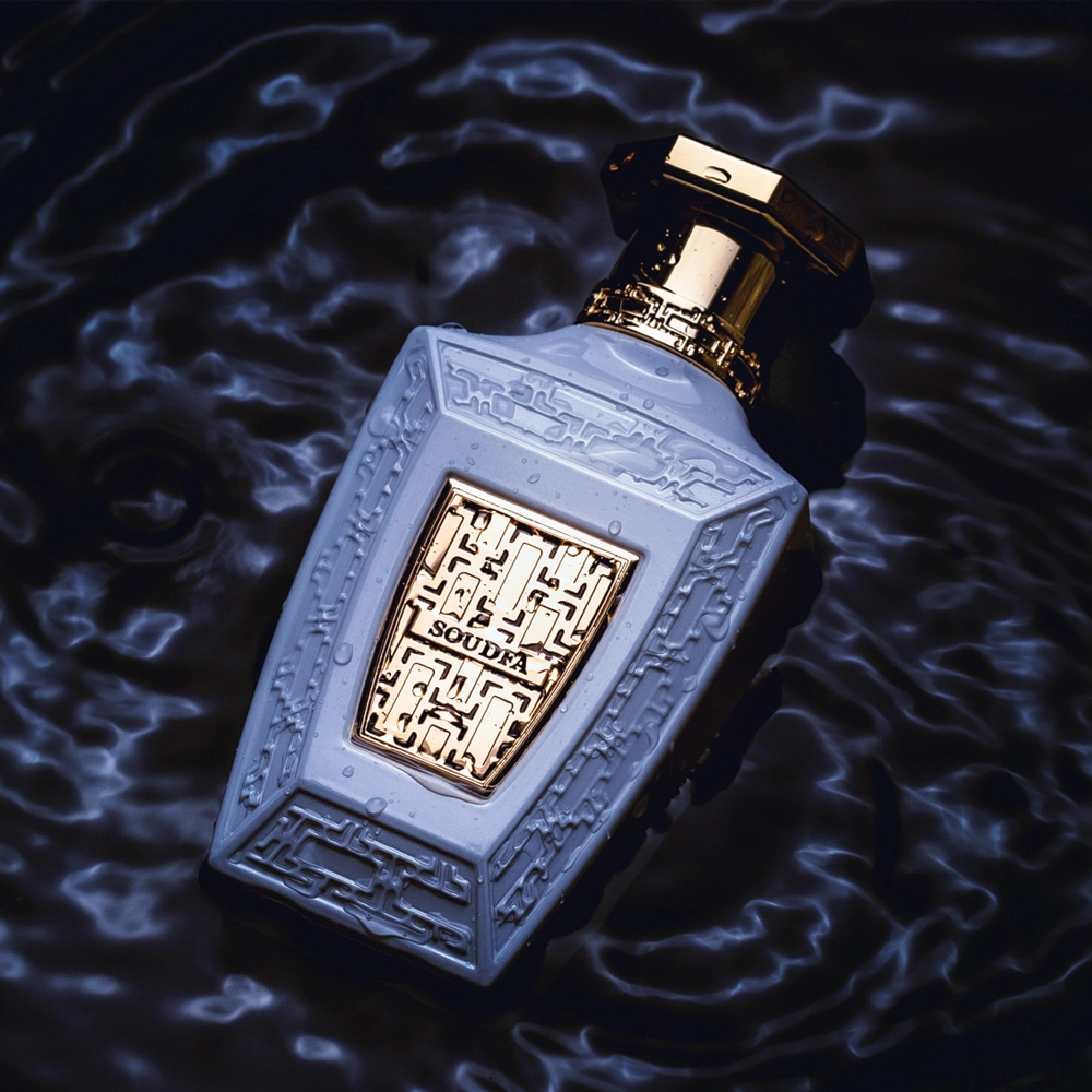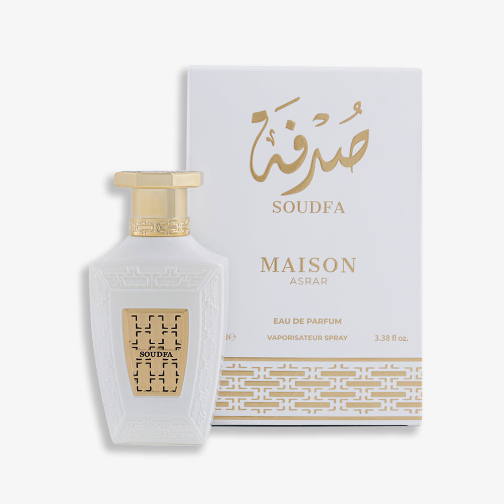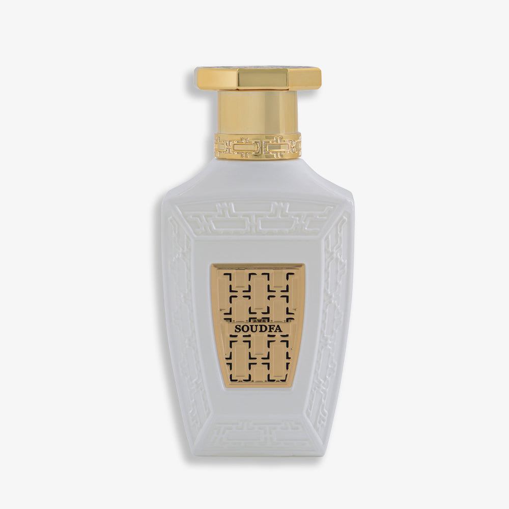 Soudfa est un élégant parfum floral et musqué avec des notes pétillantes de mandarine, de pêche et de bergamote, suivies d'un cœur délicat de rose, de jasmin et de néroli, se terminant par une base douce et poudrée de patchouli et de vétiver.