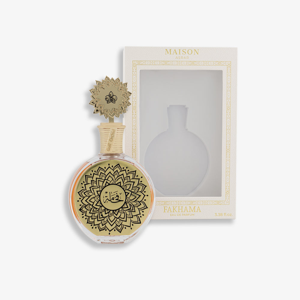 Fakhama blends orange flower, vanilla, and white florals with a warm musky base, creating a refined and sophisticated fragrance.
