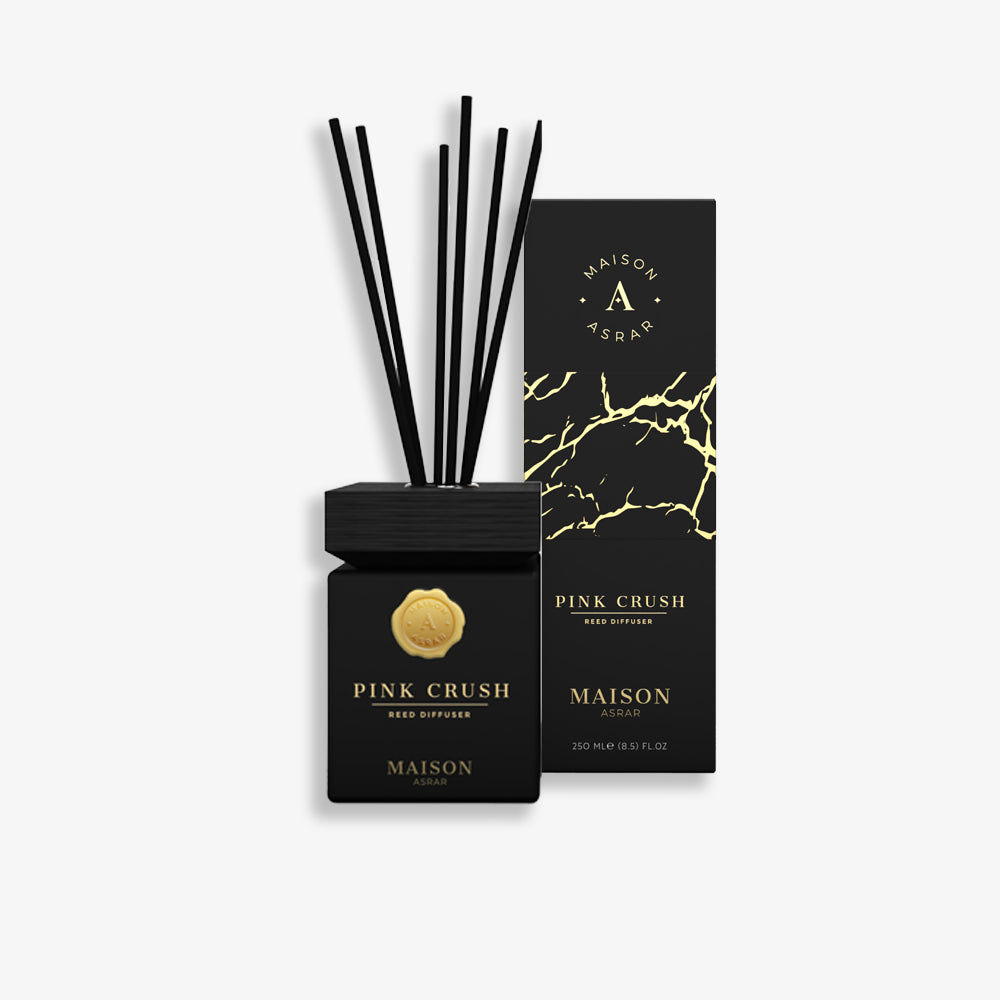 Pink Crush Reed Diffuser, featuring a delightful blend of Red Fruits and Rose, rounded out by Ambergris, Musk, and Vanilla for a long-lasting, soothing fragrance.