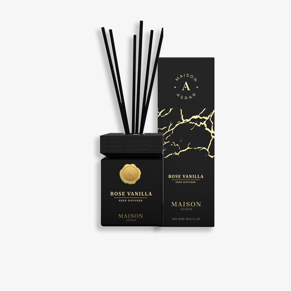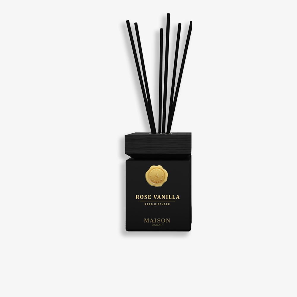 Rose Vanilla Reed Diffuser features a vibrant blend of Blackcurrant, Grapefruit, and Lychee, evolving into a heart of Raspberry, Rose, and Violet. Its warm Benzoin, Musk, and Woody base notes create an inviting atmosphere in any space.